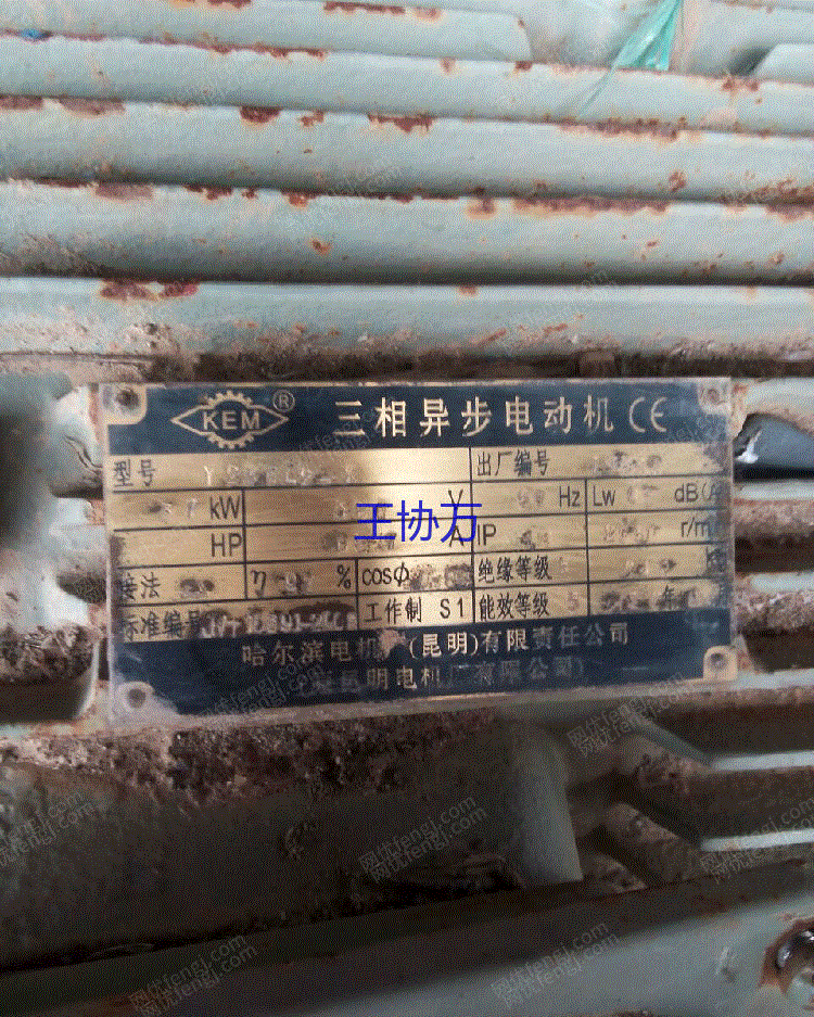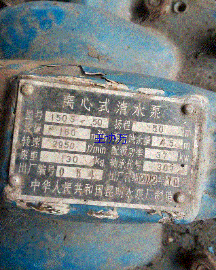 离心式清水泵 型号150S-50 扬程50m 流量160.立方/h 泵汽蚀余量4.5m转速2950r/min 配带功率37kw 轴承代号307 出厂日期2012年10月 中华人民共和国昆明水泵厂制造三相异步电动机 型号Y200L2-2 37kw 380V 50HZ Lw93dB(A) 68.7AIP44 2950r/min 效率92% cos 0.89 绝缘等级B 能效等级3 2012年9月哈尔滨电机厂(昆明)有限责任公司(原昆明电机厂有限公司)