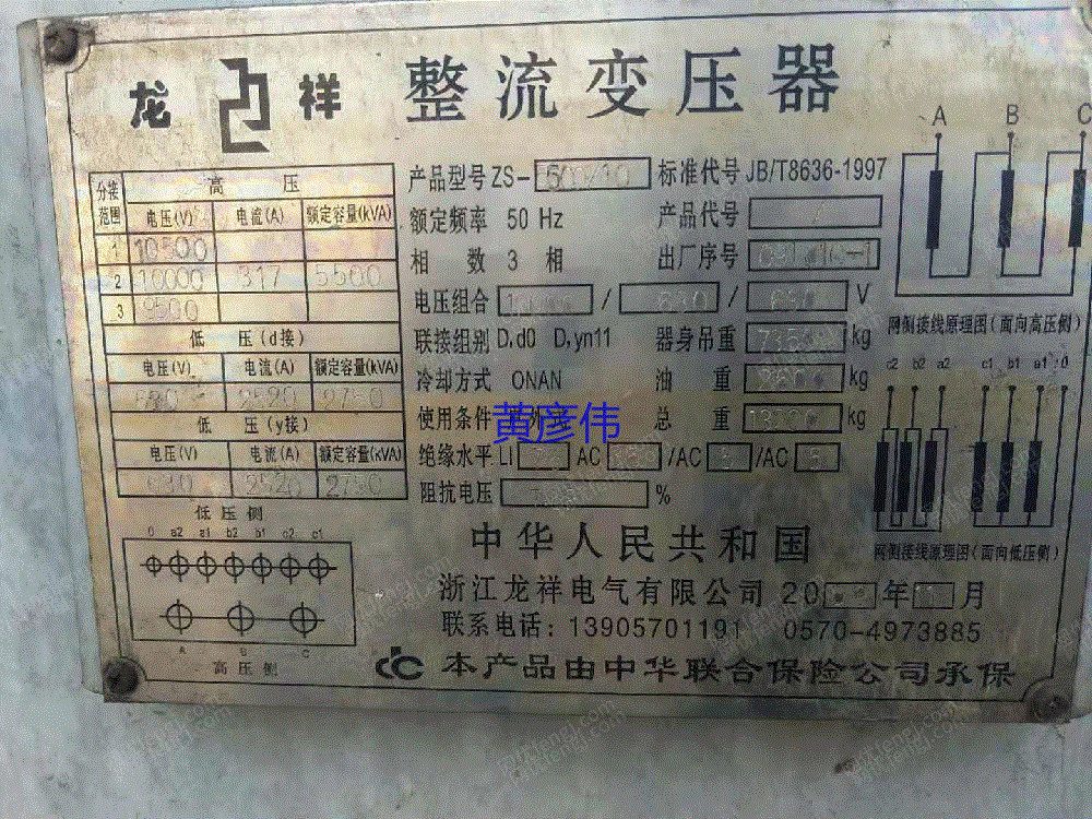 出售二手整流变压器5500KVA10KV变630V铜芯变压器一台,13931997990, 联系人: 黄彦伟