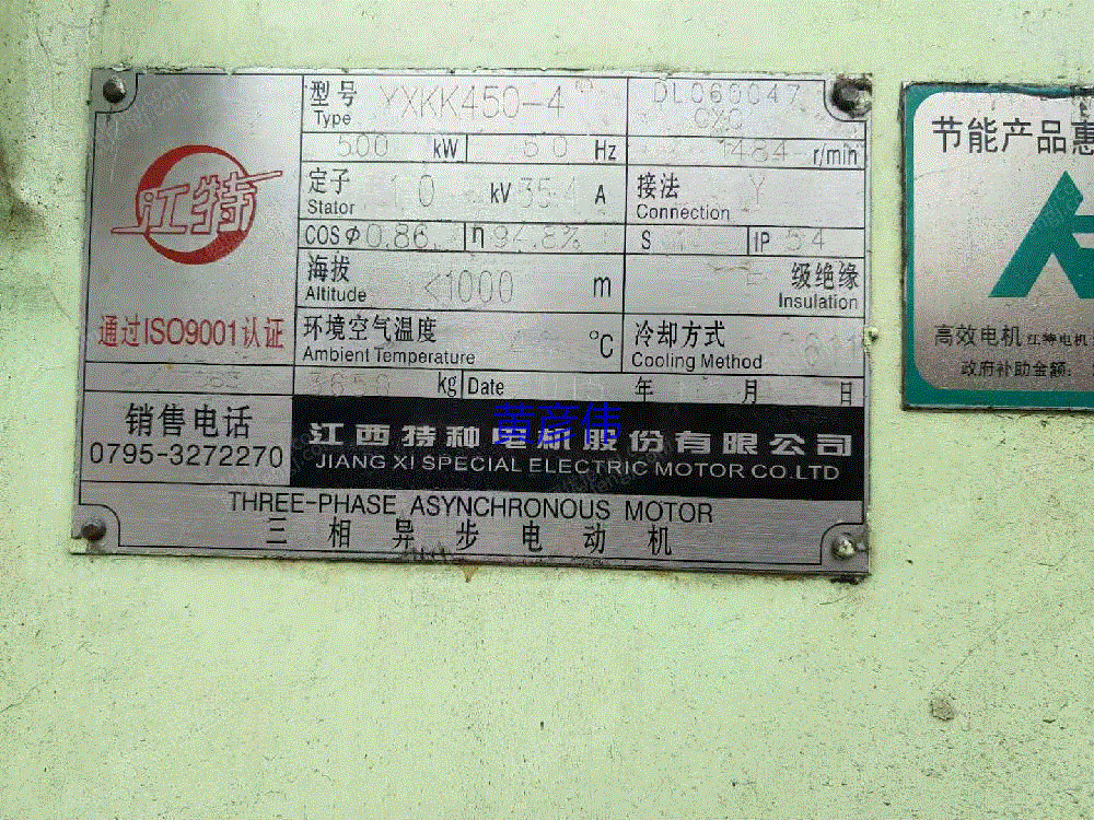 出售:YK450-4/500KW,10KV,江西特种电机2015年两台(八成新),13931997990, 联系人: 黄彦伟