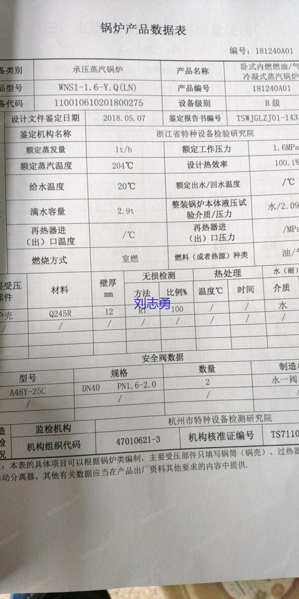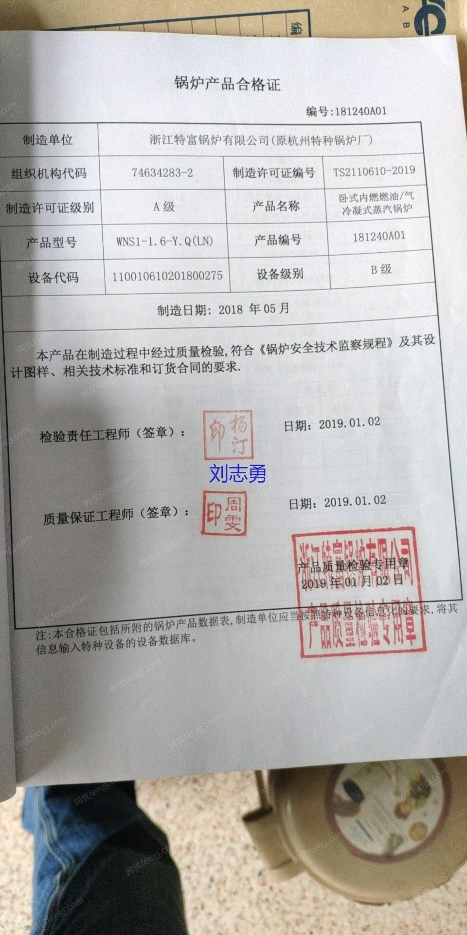 浙江特富锅炉,低氮30毫克以下,1吨燃气蒸汽锅炉,16公斤压力,手续配件齐全,热效率100.1%,冷凝式燃气蒸汽锅炉。