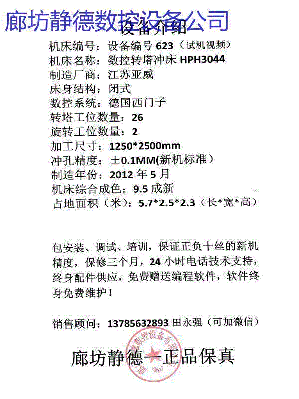出售转让_高性价比_精品二手江苏亚威数控冲床 数控转塔冲床 型号:HPH3044,冲压能力:30吨,油压式,德国西门子系统,26工位,2旋转工位, 加工尺寸:1250*2500MM,2012年5月出厂,成色:9.5成新.本机可以进行,百叶窗,单双桥等特殊工艺加工。每台设备到店都进行30多项检测,检修,确保各项功能性能达到新机水平方可出售!已调试完毕,可现场试机!现场绘图、现场打版,现场尺测精度、保证正负十丝以内的新机精度。我公司负责设备 安装、调试、培训,保修三个月,24小时技术支持,终身配件供应,免费赠送编程软件,终身免费维护,机会难得,预购从速。廊坊静德数控设备有限公司 联系人:田永强13785632893可加微信。 廊坊静德数控设备有限公司专业销售精品二手数控冲床、数控转塔冲床、数控折弯机、 数控剪板机等精品二手钣金设备。 原价60—70万、70—80万的设备,只卖10几万,20几万,性价比非常高!现货有四五十台,全部现场试机,保证新机精度。 了解更多二手设备资源,请致电--销售顾问:田永强13785632893可加微信。 常年求购数控冲床、数控转塔冲床,数控折弯机、激光切割机等数控钣金设备 。 廊坊静德数控设备有限公司 销售顾问:田永强:13785632893可加微信