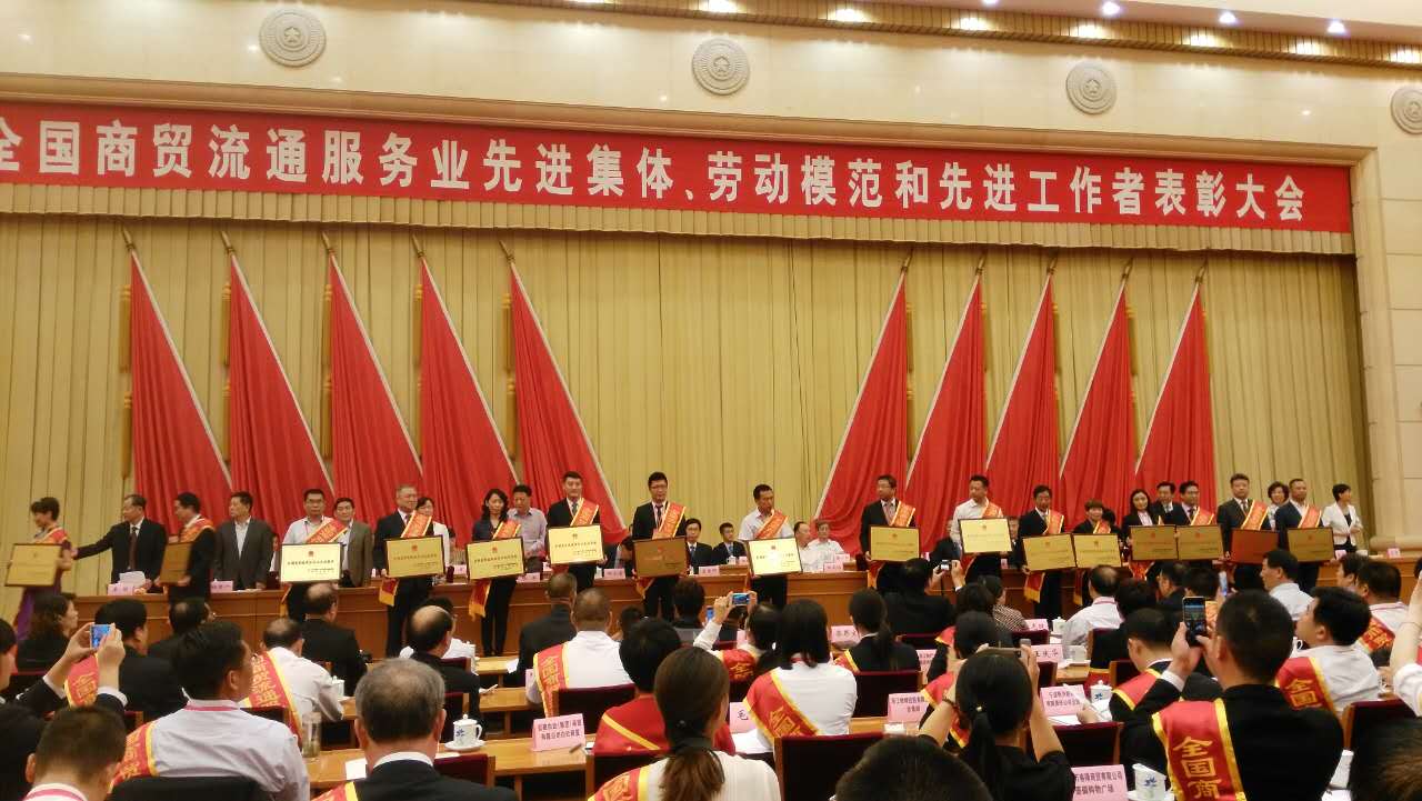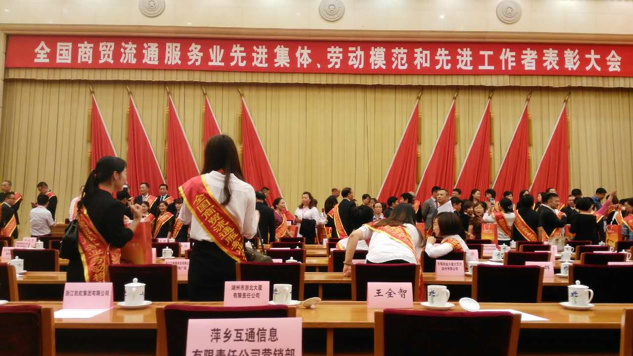 9月15日,人力资源社会保障部和中国商业联合会在北京联合召开表彰大会,对在商贸流通服务业在推动经济发展、服务人民生活、扩大就业和促进社会稳定等方面做出积极贡献的团体和个人进行了表彰,萍乡互通信息有限责任公司凭借多年优异表现和在诚信经营、保障就业、勇于承担社会责任等方面所作出的突出成绩,被授予“全国商贸流通服务业先进集体”称号!公司代表赴北京参加表彰大会,现场领取了获奖证书和荣誉牌匾。