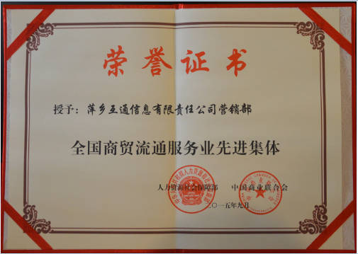 这是全国性商贸流通领域的至高荣誉,也是对萍乡互通在流通服务领域作出的成就与贡献的肯定。此次荣获全国商贸流通服务业先进集体是全体互通人的骄傲,我们 也必将以此为动力,奋发向上,继续在商贸流通服务业平凡而光荣的岗位上,承担更多社会责任,坚定不移地在这条 道路上前行!